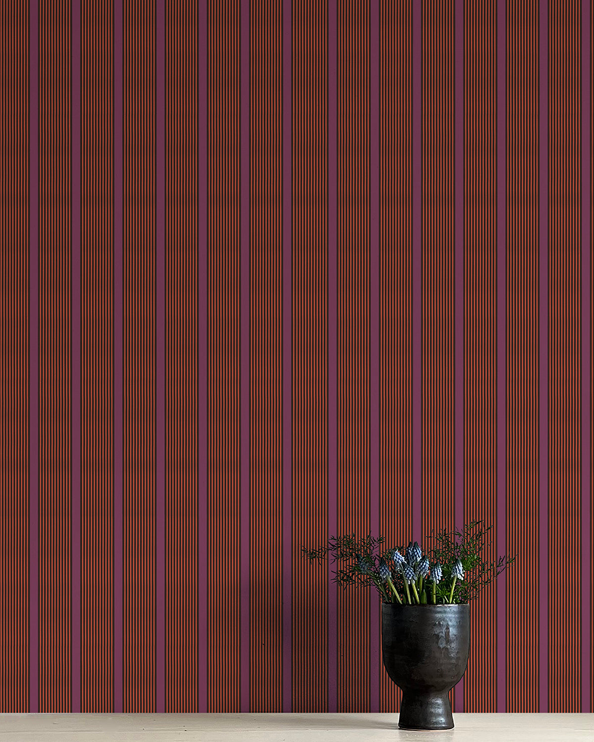 Our "Folio" wallpaper in colorway 'Costume Ball' is a classic stripe pattern. These medium-scale stripes are printed in a glorious combination of hues: darkest brown-black background with orange and muddy purple stripes. These colors sound tricky but this combination makes spaces come alive. Try it in a hallway, a bathroom, a mudroom.