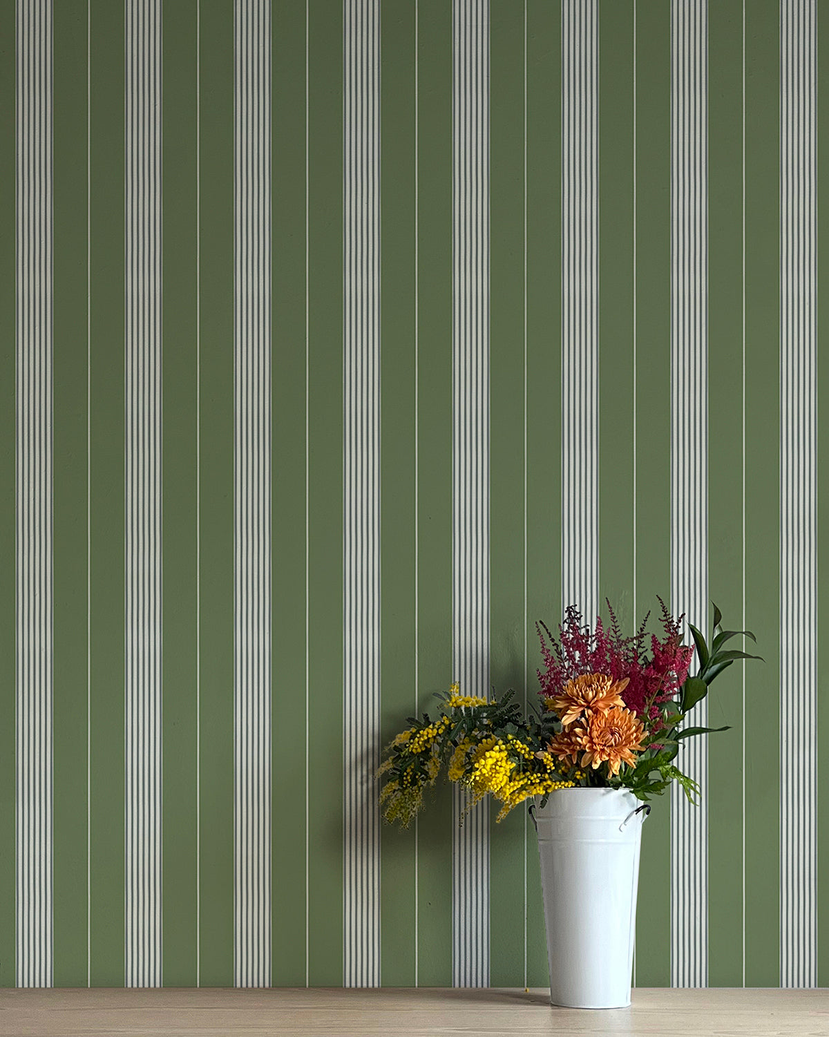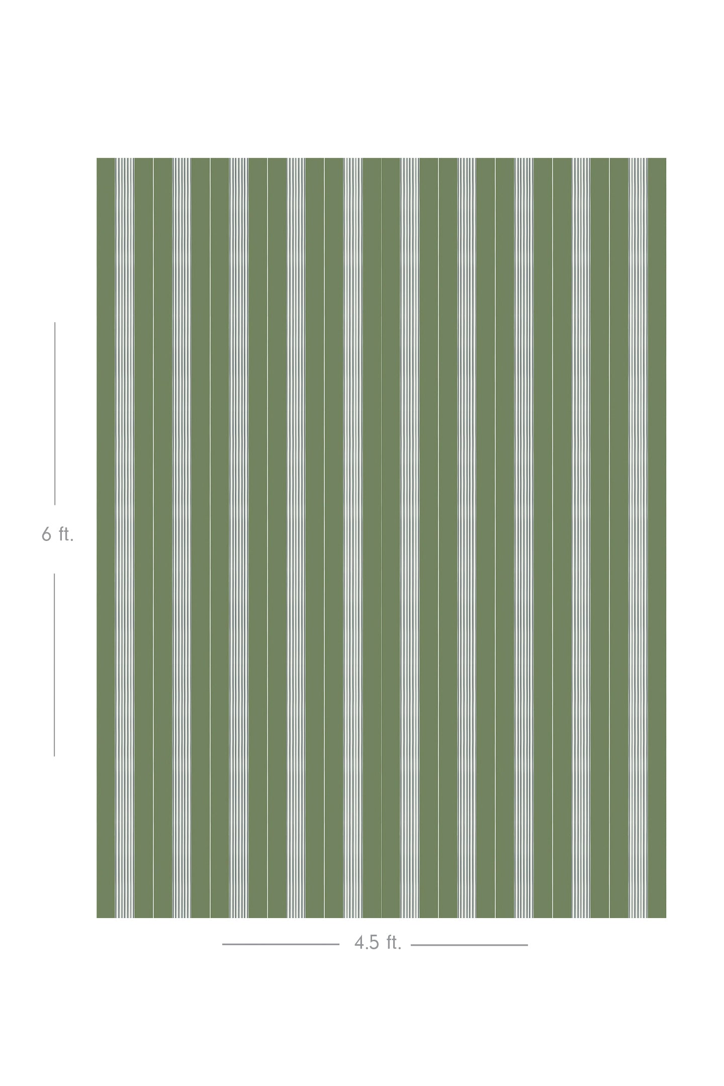 Our "Stacks" wallpaper in colorway 'Morningside' is a uniform, thick-and-thin stripe pattern inspired by the quiet experience of wandering through an organized library. Printed on each of our versatile grounds with a dark sage base color and palest egg blue stripes.