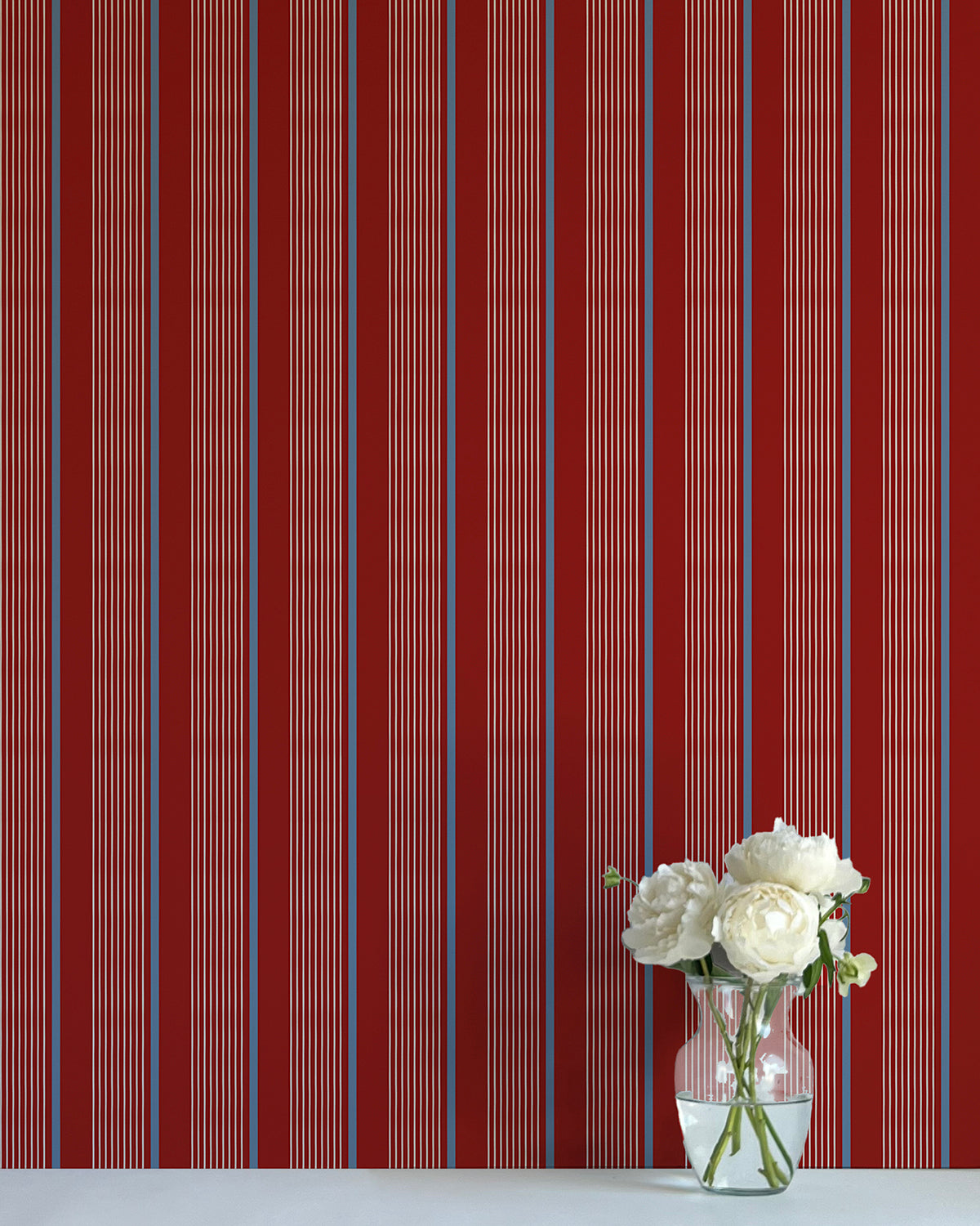 Our "Carrel" wallpaper in colorway 'Americana' is a stripe pattern with breathing room. These medium-scale stripes are printed in a friendly washed out red with small slate blue stripes alongside slender white stripes.